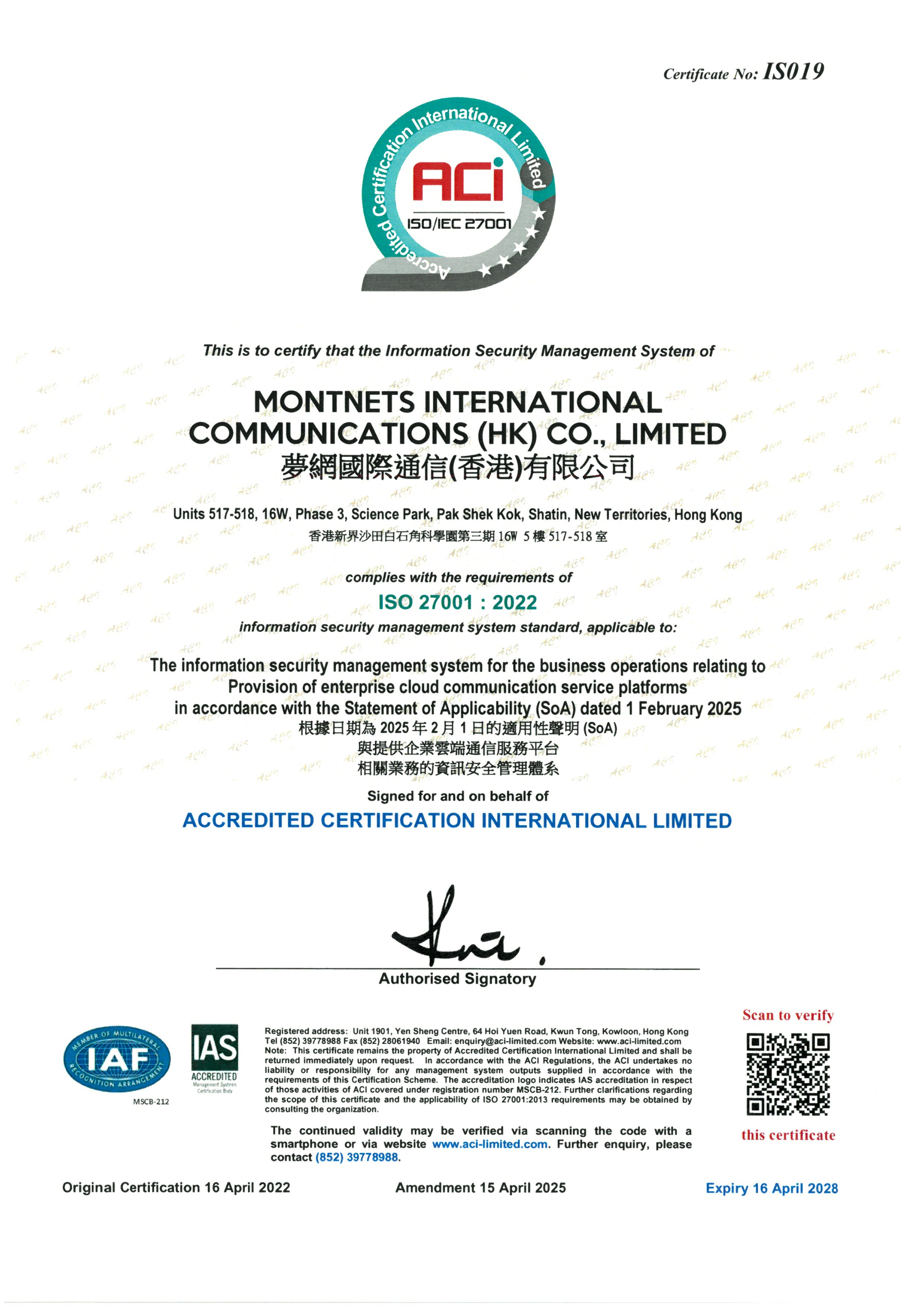 ISO27001信息安全管理体系认证证书(第六版)