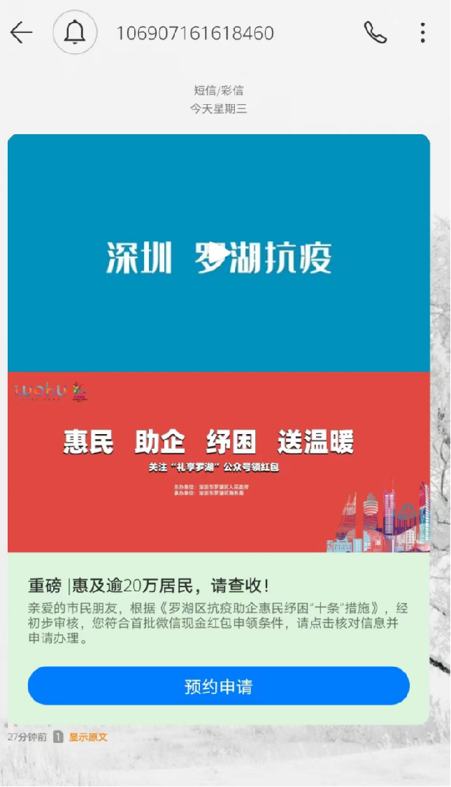 为减少疫情对经济社会的影响,不少地区都出台了惠民纾困政策。日前,罗湖区推出“惠民纾困扶持”措施,面向罗湖区22.5万人,向符合扶持条件都市民发放300元补贴或生活必需品。基于该措施覆盖面广、惠民力度大,为确保补贴措施的落地落实,艾弗森贝博ballbet官网科技携手深圳联通助力罗湖区人民政府向扶持对象统一推送5G申领信息,助力区政府完成补贴发放。
